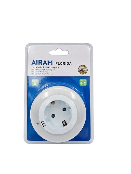 Florida toimii sekä yövalona että pistokkeena. Pistorasian kehykseen on merkitty pykälät, joista valon väri vaihtuu. Voit valita valon väriksi vaaleanpunaisen (P), vaaleansinisen (B) tai valkoisen (W). Ota kiinni valorenkaasta ja napsauta renkaassa näkyvä pieni nuoli haluamasi väripykälän kohdalle. Yövalo on varustettu myös hämäräkytkimellä. Valonlähde kiinteä 3 x 3 led 0,5 W, 8 lm. IP20, vain sisäkäyttöön. 230 V ~50Hz.