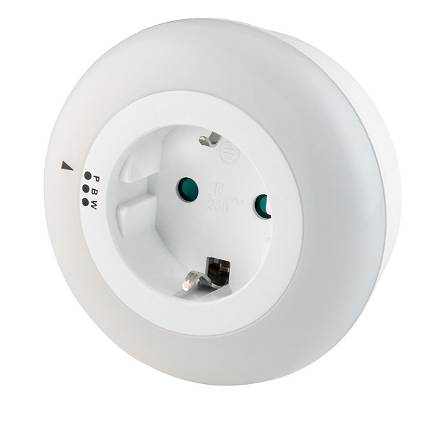 Florida toimii sekä yövalona että pistokkeena. Et menetä mahdollisesti huoneen ainoaa pistokepaikkaa yövalolle! Pistorasian kehykseen on merkitty pykälät, joista valon väri vaihtuu. Voit valita valon väriksi vaaleanpunaisen (P), vaaleansinisen (B) tai valkoisen (W). Ota kiinni valorenkaasta ja napsauta renkaassa näkyvä pieni nuoli haluamasi väripykälän kohdalle. Yövalo on varustettu myös hämäräkytkimellä. Pimeässä huoneessa Florida alkaa loistaa valitsemassasi sävyssä. Vain sisäkäyttöön.