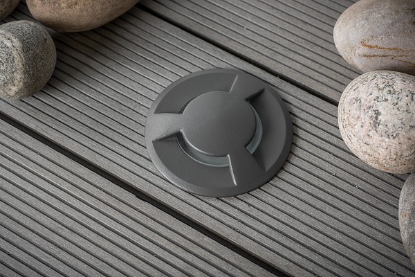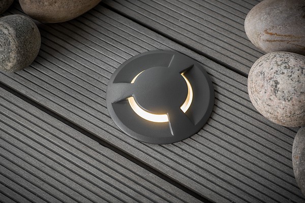 Sivusuuntiin valaiseva upotettava terassivalaisin, joka soveltuu sekä sisä- että ulkokäyttöön. Kestää päältä kävelyä, IK03. IP65. Runko alumiinia, koristerengas ruostumatonta terästä, sävy antrasiitti. Mattalasikupu. Valitse haluamasi PAR16-kupuinen ja GU10-kantainen led-lamppu, maks. 7 W, ei sisälly pakkaukseen. Ketjutettavissa.