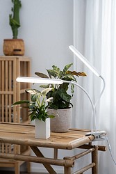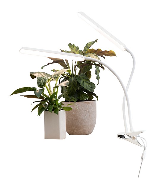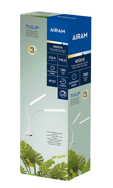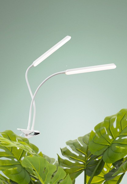 Kasvivalaisin kahdella taipuisalla varrella ja valonlähteellä. Kohdista valot erikseen. Kätevä klipsikiinnitys sopii maks. 30-35 mm paksuiseen pöytälevyyn. Led kiinteä 4000 K 16 W 780 lm. 5-portainen himmennys, 3-portainen ajastus (8/12/16 h). Nollaa ajastin irrottamalla valaisin virtalähteestä. AC 220 - 240 V. Sisäkäyttöön, IP20. Ei sovellu huonevalaistukseen.