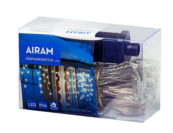 1,2 m levyinen led-jääpuikkosarja, josta roikkuu 13 kpl 35-85 cm pituisia led-ketjuja. Led 72 kpl lämmin valkoinen, ei vaihdettava, kytketty 8 ledin sarjaan. Johto kirkas. Mukana 10 kpl nippusiteitä. Sisä- ja ulkokäyttöön. Muuntaja 31 V 3,6 VA IP44.