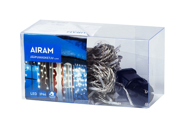 6,8 m levyinen led-jääpuikkosarja, josta roikkuu 35 kpl 27-72 cm pituisia led-ketjuja. Led 140 kpl lämmin valkoinen, ei vaihdettava, kytketty 10 ledin sarjaan. Johto kirkas. Mukana 10 kpl nippusiteitä. Sisä- ja ulkokäyttöön. Muuntaja 31 V 6 W IP44.