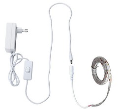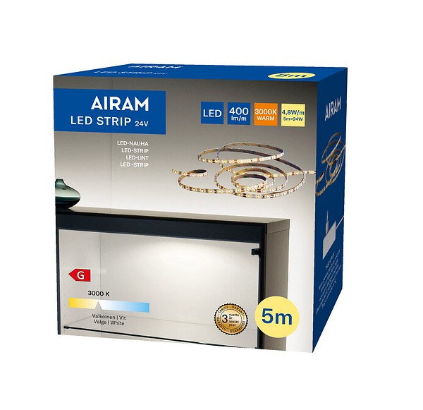 5 m pituinen led-nauha sisäkäyttöön, IP20. Valon värilämpötila valkoinen 3000 K. Led 24 V 4,8 W/m. Tee tyylikkäitä korostuksia ja luo epäsuoraa valaistusta. Helppo asentaa, nauhassa kiinni 3M-tarra. Voi lyhentää 100 mm välein. Sisältää pistokemuuntajan, johdossa on/off-kytkin.