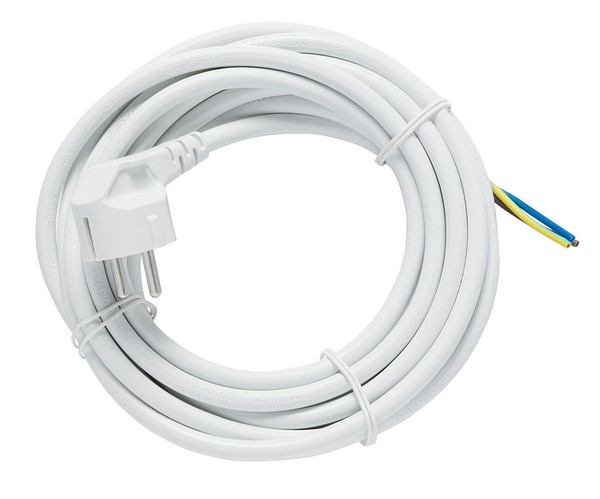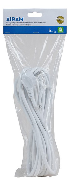 5 m mittainen liitäntäjohto pistotulpalla. Taipuisa kaapeli, väri valkoinen. Sisäkäyttöön, IP20. H05VV-F 3X1,5MM². Eri tarpeisiin ja eri laitteille.