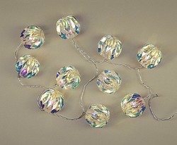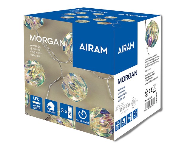 Morgan valosarja, jossa 10 kpl PET-muovista valmistettua särmikästä palloa. Led 10 kpl lämmin valkoinen, ei vaihdettava. Valo-osuuden pituus 1,35 m, koristeiden väli 15 cm. Paristot 3 x AA, ei sisälly. Sisältää ajastimen. Sisäkäyttöön.