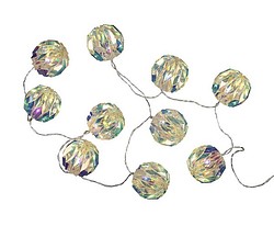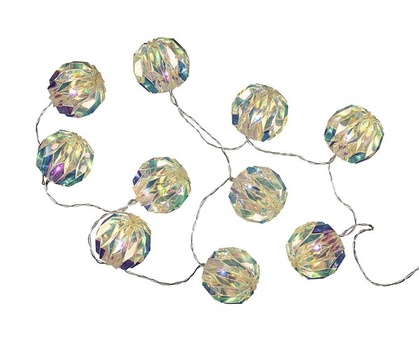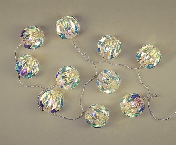 Ilmeikäs valosarja, jossa kymmenen PET-muovista valmistettua särmikästä koristepalloa. Pallojen materiaali saa pinnan hehkumaan upeissa sävyissä! Kevyen rakenteen ansiosta valosarja on helppo ripustaa haluttuun paikkaan tai sillä voi koristella vaikkapa pöytäkattauksen. Tuote toimii paristoilla ja se on tarkoitettu sisäkäyttöön.