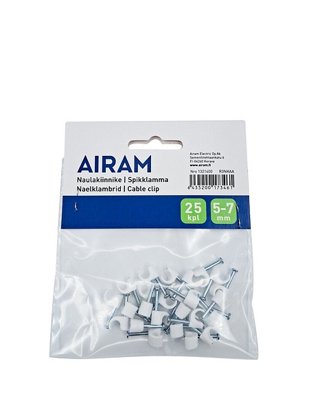 5-7 mm naulakiinnike 25 kpl pussissa. Kiinnitä johdot siististi ohutnaulaisella kiinnikkeellä. Valmistettu Euroopassa.