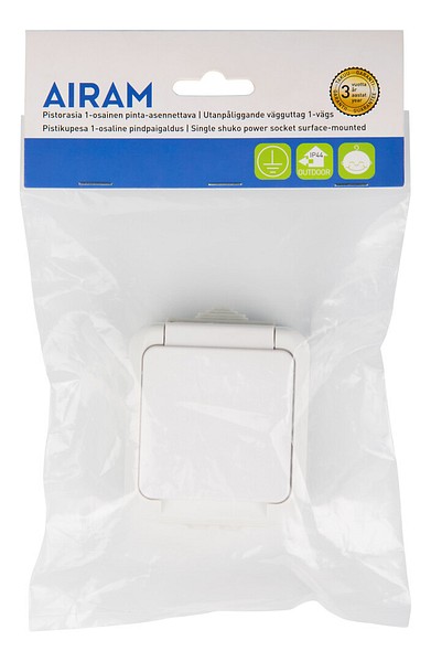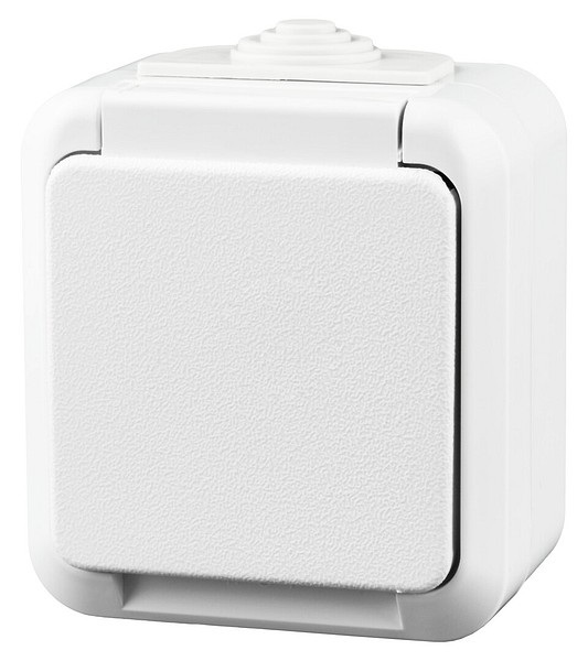 Pinta-asennettava 1-osainen maadoitettu pistorasia. Läppäkansi. Soveltuu kosteisiin tiloihin sekä sisä- että ulkokäytössä, IP44. Valkoinen.