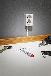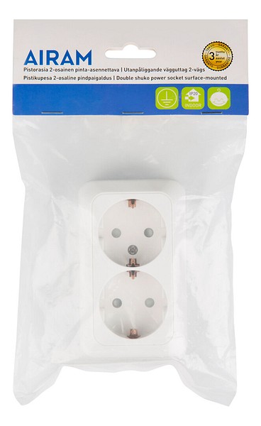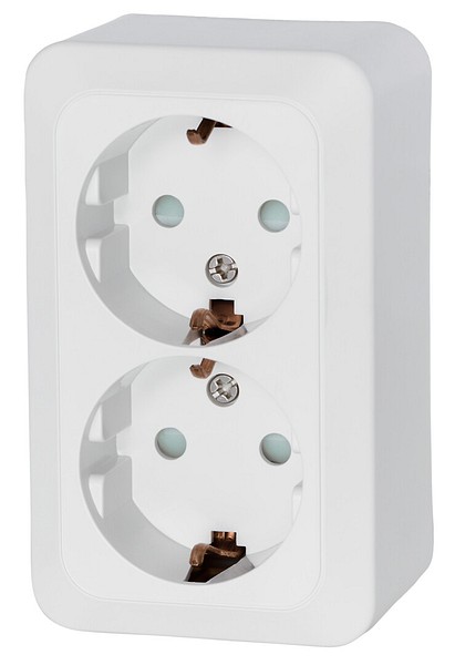 Pinta-asennettava 2-osainen maadoitettu pistorasia. Soveltuu sisäkäyttöön kodin kuivissa tiloissa, IP20. Valkoinen.