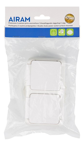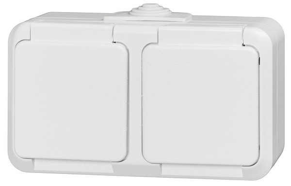 Pinta-asennettava 2-osainen maadoitettu pistorasia. Läppäkannet. Soveltuu kosteisiin tiloihin sekä sisä- että ulkokäytössä, IP44. Valkoinen.