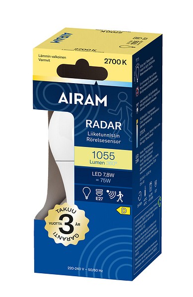 | LED A60 827 1055lm E27 RADAR OP | Airam opaali vakiokupu liiketunnistimella E27 2700K 1055lm |