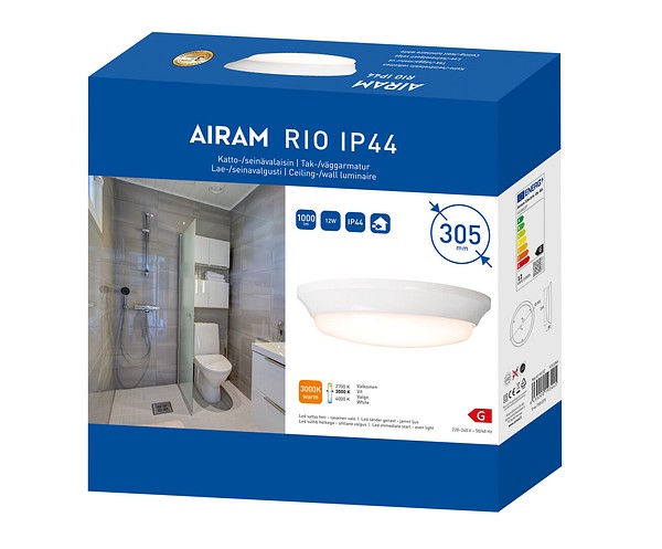 Rio 305 3000 K. Kestävä yleisvalaisin soveltuu mm. kylpyhuoneeseen ja autokatokseen, Ø 305 mm. IP44. IK10. Runko muovia (PC), kupu opaalimuovia (PC), valkoinen. Kiinteä led 12 W 1000 lm 3000 K. Pinta-asennus suoraan jakorasiaan, soveltuu läpijohdotukseen. Hyötyelinikä 35 000 h.