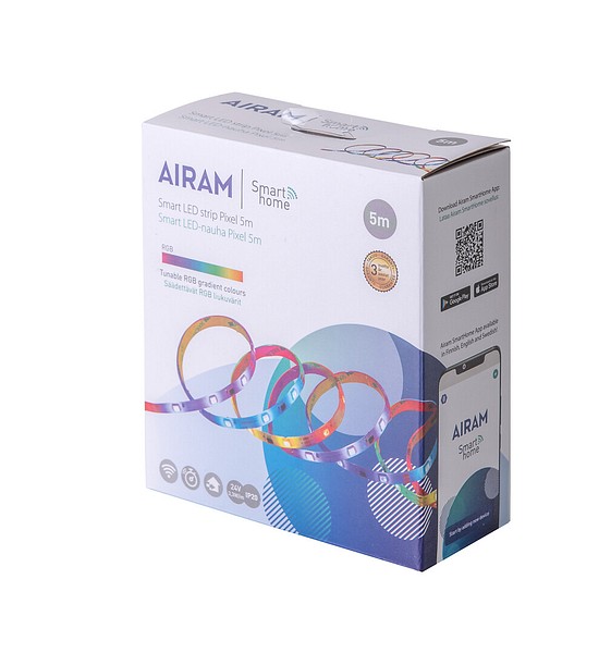 Airam SmartHome Pixel RGB led-nauhalla luot kotisi sisustukseen epäsuoraa valoa ja yllätyksellisiä valoefektejä. Kytke led-nauha pistokkeeseen ja yhdistä se kotisi suojattuun WiFi-verkkoon maksuttoman Airam SmartHome -sovelluksen avulla. 24 V 3,3 W/m. RGB, liukuväriefekti. Nauhan pituus 5 m, nauhan voi leikata haluttuun pituuteen 167 mm välein. Vain sisäkäyttöön, IP20.