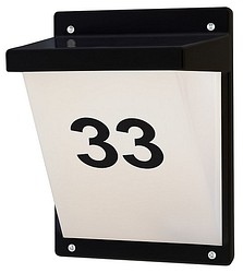 Reilunkokoisesta yleis- ja numerovalaisimesta talon numero näkyy selkeästi. Vino-valaisimella on paras iskunkestävyysluokka IK10, joten se sopii hyvin opastevaloksi katujen varsilla olevien talojen seinään. Valaisimen UV-suojattu runko ei haalistu auringonvalon vaikutuksesta. Pakkauksessa mukana mustat kirjain- ja numerotarrat (A–J / 2 x 0–9). Valonlähteeksi suosittelemme E27-kantaista A60-kupuista led-lamppua.