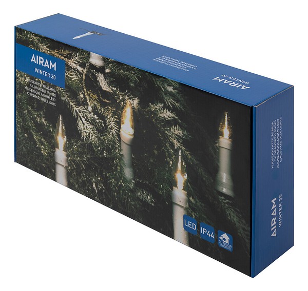 Ulkokäyttöön soveltuva kuusenkynttiläsarja, 30 kynttilää. Led 30 kpl lämmin valkoinen, ei vaihdettava, rinnankytketty. Materiaali muovi ja metalli. Valo-osuuden pituus 27,4 m. Johto tumma. Muuntaja 6 V 2 VA IP44.