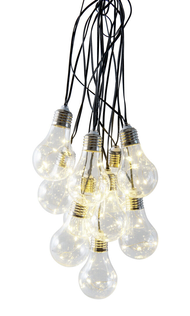 Aurinkokennolla toimiva lamppusarja, jossa kymmenen kirkasta, hehkulampun muotoista lamppukupua. Jokaisen lampun sisällä valolanka, jossa viisi lediä. Vaihdettava paristoakku. Solar-valot luovat tunnelmaa hämärtyviin kesäiltoihin. Koristele parvekkeesi kauniilla valosarjalla tai asettele valonpisaroita pihapuuhun tai terassille.