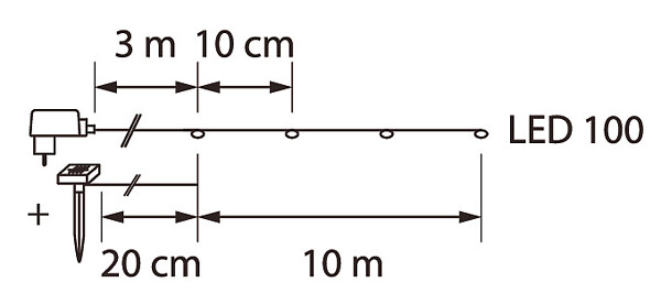 Huikea 9,9 metriä pitkä valolanka, jossa 100 lämpimän valkoista lediä! Koristele monipuolisesti sekä sisällä että ulkona. Valolangan mukana tulee aurinkokenno ja muuntaja. Vaihda virtalähdettä helposti käyttötarpeen ja vuodenajan mukaan. Liitosjohto 3 m. Pakkauksessa mukana maapiikki aurinkokennolle.